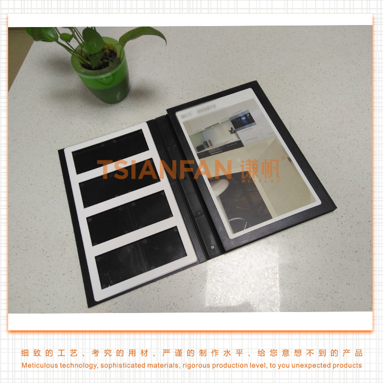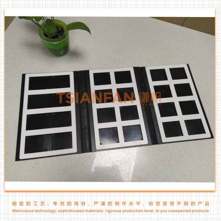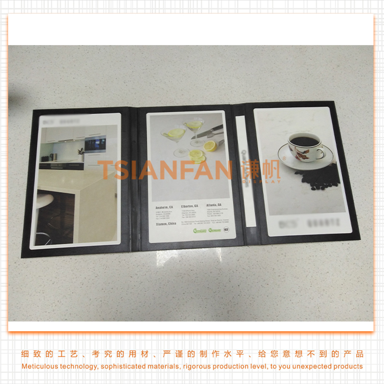 石英石3折頁樣品冊是為石材、瓷磚、石英石或玻璃等建材樣品而設(shè)計的, 要求您的樣品應(yīng)低于5mm厚度。