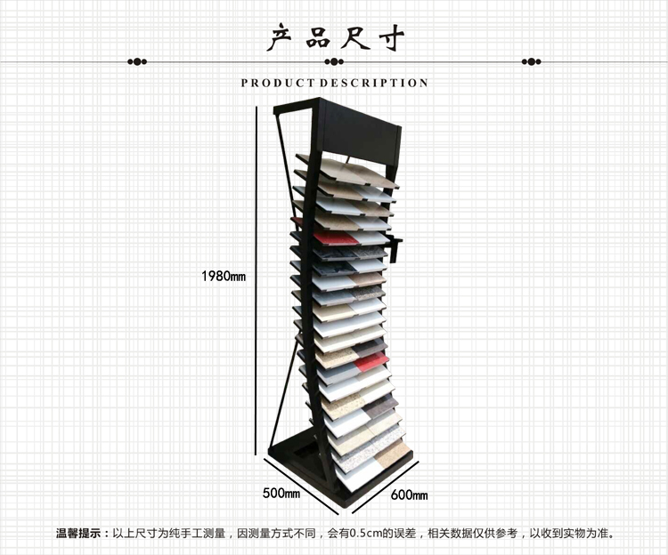 | 使用場(chǎng)景 | 可展示石材,瓷磚,木地板等建材樣品,可用于門(mén)店,展廳,展會(huì)等地方 |